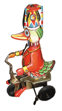 Depuis plus de 600 ans, l'activité de Nuremberg en Allemagne est traditionnellement organisée autour du jouet. Jusque vers 1850, les jouets de Nuremberg en Allemagne sont encore en majorité fabriqués manuellement à partir de matériaux tels que le bois, le papier ou le papier mâché. A partir de 1850, cependant, l'utilisation plus fréquente de presses et de presses à estamper à fonctionnement manuel ou automatique, ainsi que la production moins onéreuse de la tôle permettent de fabriquer, en usine, des jouets en métal. On voit ainsi les ateliers traditionnels qui travaillent les métaux et les nouvelles entreprises fondées par de riches marchands se transformer peu à peu en fabriques de jouets en métal. Leurs produits de haute qualité reflètent une société toujours plus marquée par les avancées technologiques (trains, machines à vapeur, figurines mécaniques, lanternes magiques, etc.) et donnent vie à un "monde métallique". Nuremberg est devenue le premier centre de production de jouets en métal. Ses produits sont vendus dans le monde entier par l'intermédiaire des plus importantes sociétés d'exportation. Serge Ramel nous cite alors des marques prestigieuses : Schuco, l’une des plus connues, Bing ou encore Lehman. Il possède d’ailleurs dans sa collection, le chien Schuco qui fit un tabac au moment de sa sortie.