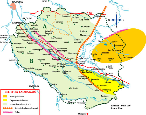 Le monde des collines se développe de St Félix à Lanta, de Verfeil à Auterive, de Puylaurens à Belpech. On doit distinguer deux blocs de part et d’autre de la gouttière de l’Hers Mort.