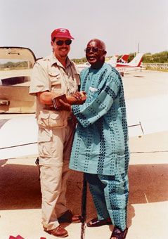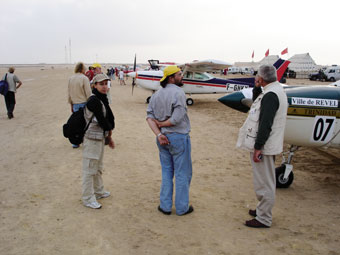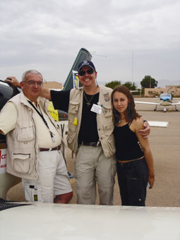 | Jean-Louis Cigliana, vainqueur du rallye aérien Toulouse-Saint Louis du Sénégal Depuis 1983, une vingtaine d’équipages s’embarquent début octobre à Toulouse pour rallier Saint Louis du Sénégal dans des avions à 4 places, sur les traces des pionniers de l’aéropostale. Jean-Louis Cigliana, vainqueur en 2003 et 2004 sur le Ville de Revel, nous fait partager sa passion pour ce rallye mythique. Un rêve qui devient réalité |  2004 - Escale sous le soleil d'Agadir pour Georges Bénécos, Jean-Louis Cigliana et sa fille Camille |