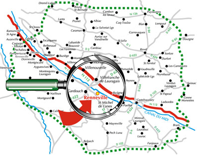Renneville, petit village calme, situé près d’une sortie de l’Autoroute A 61, non loin de l’ancienne voie romaine d’Aquitaine (itinéraire emprunté depuis des siècles), sans en subir les nuisances, traversé par le canal des Deux Mers, est un lieu de prédilection.